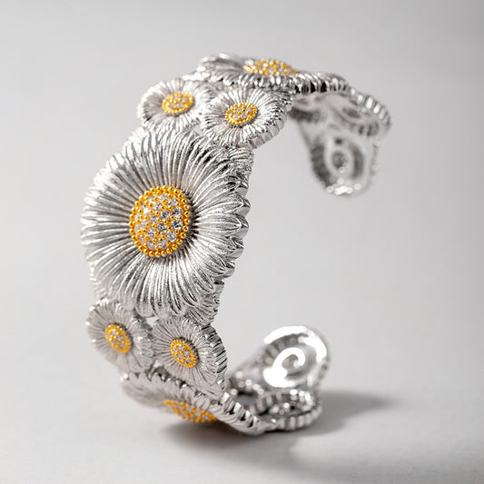 Vintage-Inspired Silver Bracelet with Gold-Plated Daisies and Semi-Precious Stones